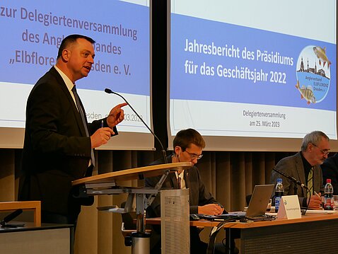 Im Präsidium auf Regional- und Landesverbandsebene herrscht Einigkeit, dass wir unseren Hegebeitrages als Angler nicht absprechen lassen und alles dafür tun werden, unsere vertraglichen und gesetzlichen Rechte als Angler einzufordern. In diesem Zusammenhang begrüßte unser Präsident die Initiative des Sächsischen Landtagspräsidenten Dr. Matthias Rößler, der unser gemeinsames landesverbandsübergreifendes Arbeitspapier mit dem Titel „Gefährdung der Angelfischerei und des Gemeinwohls im Freistaat Sachsen“ wenige Wochen vor unserer Versammlung an alle Fraktionen im Sächsischen Landtag zur Kenntnis übergeben hatte. Präsident Udo Witschas bedankte sich hierfür ganz ausdrücklich. Er stellte auch klar, dass auch wir Angler auf eine breite politische Unterstützung angewiesen sind. Leider war der eingeladene Vertreter des Sächsischen Staatsministerium für Energie, Klimaschutz, Umwelt und Landwirtschaft zur Delegiertenversammlung kurzfristig verhindert und hatte seine Teilnahme einen Tag vor der Veranstaltung kurzfristig abgesagt. Natürlich waren wir etwas enttäuscht darüber, dass keine entsprechende Vertretung unserer Einladung gefolgt ist. Gern hätten wir unsere Leistungen als organisierte Angler, aber auch unsere Sorgen und Probleme direkt beim richtigen Adressaten des für uns zuständigen Ministeriums angebracht, was somit aber nicht erfolgen konnte. Wir werden dennoch weiter am Ball bleiben und uns die entsprechende politische Hilfestellung einholen, um das Angeln in unserer Heimat zu bewahren.